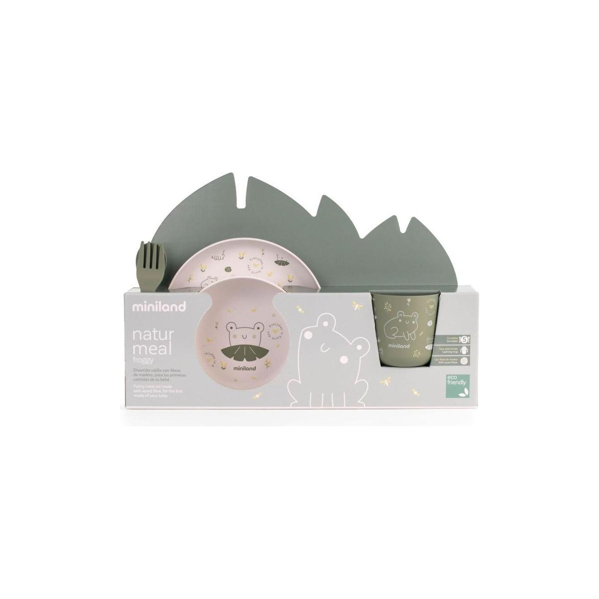 Del campo a tu mesa Una completa vajilla con motivos de ranitas o pollitos para los más peques, que cuenta con 5 piezas (plato, bol, vaso, tenedor y cucharita) y realizada en materiales 100% de origen natural y biobasados. Con sus reducidas dimensiones, podrán disfrutar solitos de la comida y aprender sobre los alimentos.